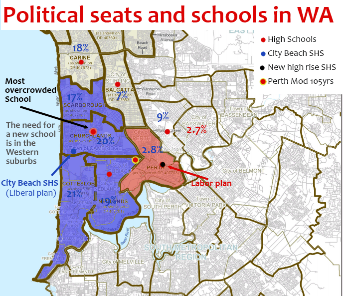 However the overcrowded and fastest growing schools are in solid Liberal held seats with 20% margins (blue area). Does Labor care about these voters (or their children)? Instead they are moving a school that doesn’t want to be moved, destroying the heritage and community there, building a new expensive rental high rise school where there are hardly any kids, and appear to be selling the reputation of the top public school in the state to marginal voters in the seat of Perth. (Marked in red).